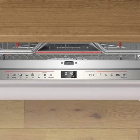 Bosch Serie 6 , Volledig geïntegreerde vaatwasser, 60 cm, XXL (extra hoog), SBD6ECX12E. Apparaatplaatsing: Volledig ingebouwd, Productafmeting: Volledige grootte (60 cm), Kleur bedieningspaneel: Roestvrijstaal. Aantal couverts: 14 couverts, Geluidsemissieklasse: B, Geluidsniveau: 42 dB. Voetenverstelling: 6 cm, Bedieningsapps ondersteund: Home Connect. Energie-efficiëntieklasse: A, Waterconsumptie per cyclus: 9 l, Energieverbruik per 100 cycli: 54 kWu. Breedte: 598 mm, Diepte: 550 mm, Hoogte: 865 mm