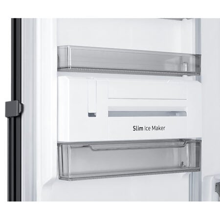 De compacte ijsdispenser neemt minder vriezerruimte in, omdat hij in de deur is geïntegreerd. Daardoor houd je kostbare extra opslagruimte over op de planken. Maar aan ijs zal je geen gebrek hebben, want deze ijsdispenser kan nog steeds 5x de hoeveelheid opslaan die hij kan maken. En met één simpele beweging komen de ijsklontjes vrij.
