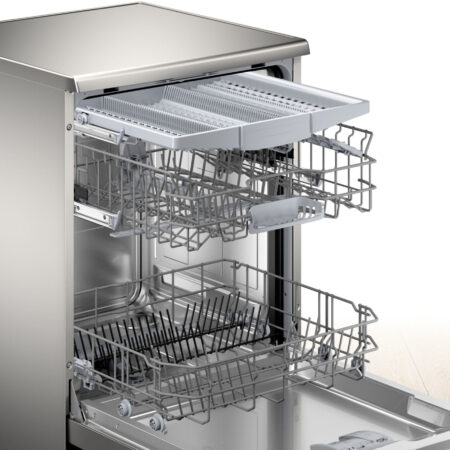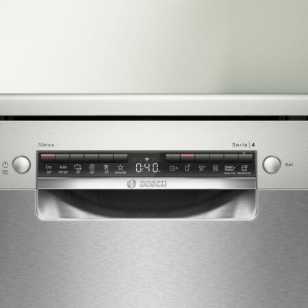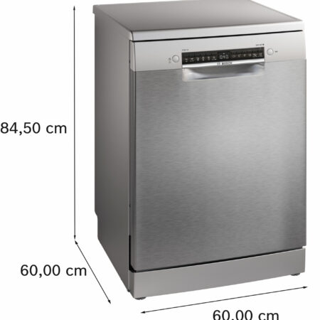 Bosch Serie 4 SMS4HMI07E. Apparaatplaatsing: Vrijstaand, Productafmeting: Volledige grootte (60 cm), Deurkleur: Roestvrijstaal. Aantal couverts: 14 couverts, Geluidsemissieklasse: B, Geluidsniveau: 42 dB. Voetenverstelling: 2 cm, Bedieningsapps ondersteund: Bosch Home Connect. Energie-efficiëntieklasse: D, Waterconsumptie per cyclus: 9 l, Energieverbruik per 100 cycli: 85 kWu. Breedte: 600 mm, Diepte: 600 mm, Hoogte: 845 mm