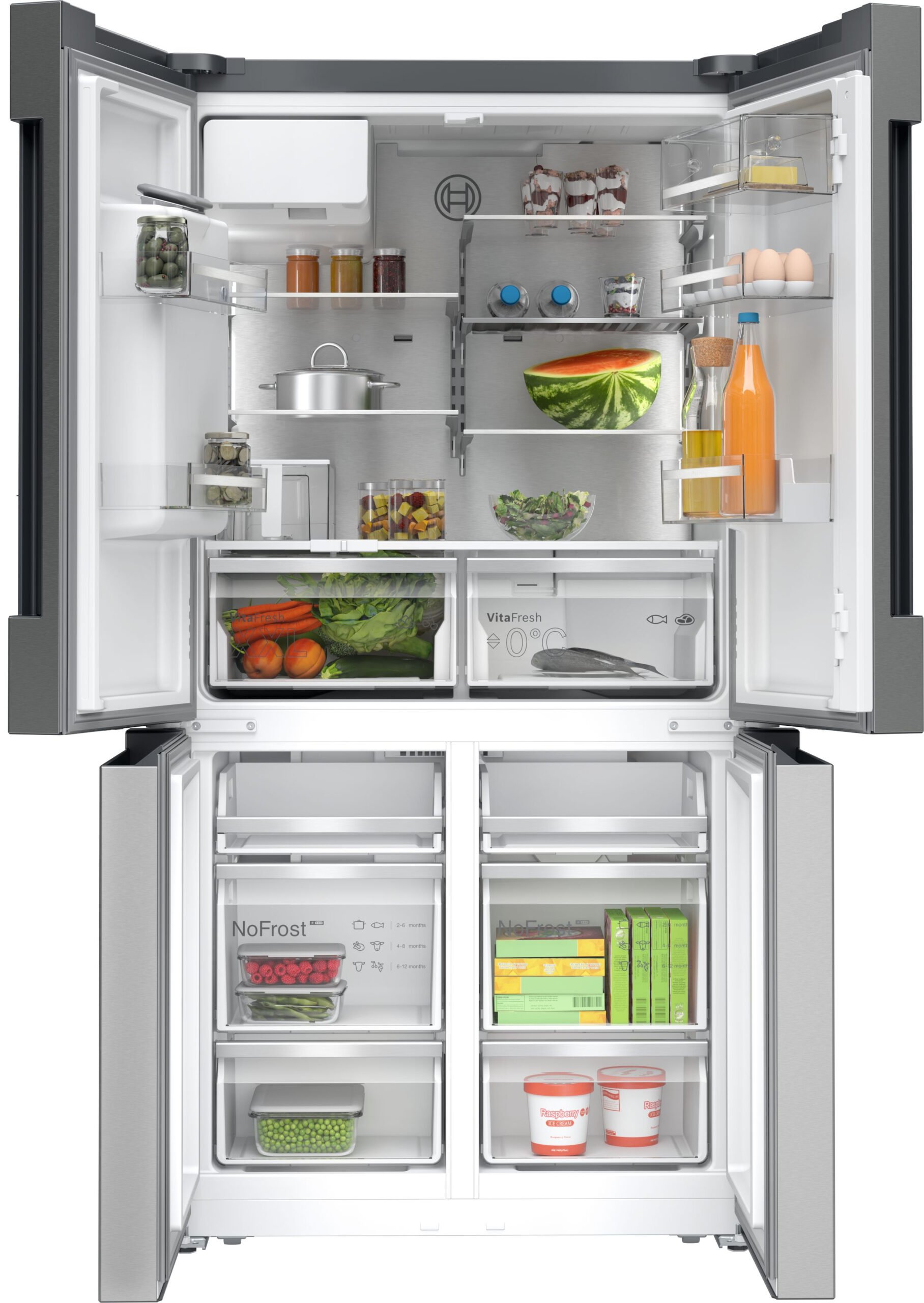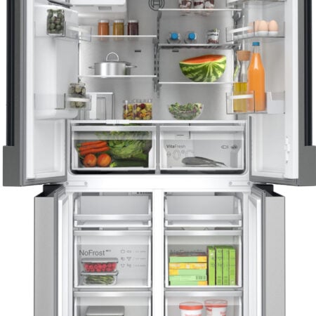 Bosch Serie 6 KFI96APEA. Apparaatplaatsing: Vrijstaand, Productontwerp: Multideur, Kleur van het product: Geborsteld staal. Totale nettocapaciteit: 574 l, Klimaatklasse: SN-T, Geluidsemissieklasse: C. Nettocapaciteit koelkast: 375 l, Soort lamp: LED. Nettocapaciteit vriezer: 199 l, Vriezer positie: Onder, Vriescapaciteit: 16 kg/24u. Snoerlengte: 2,4 m, Bedieningsapps ondersteund: Home Connect