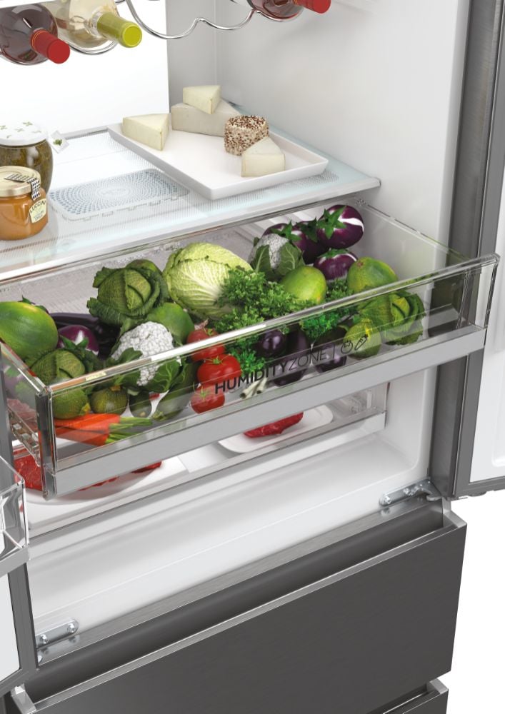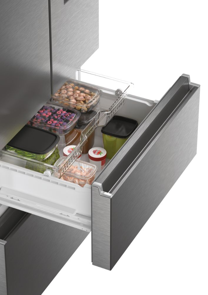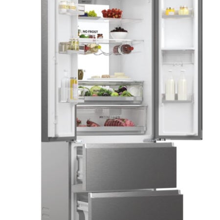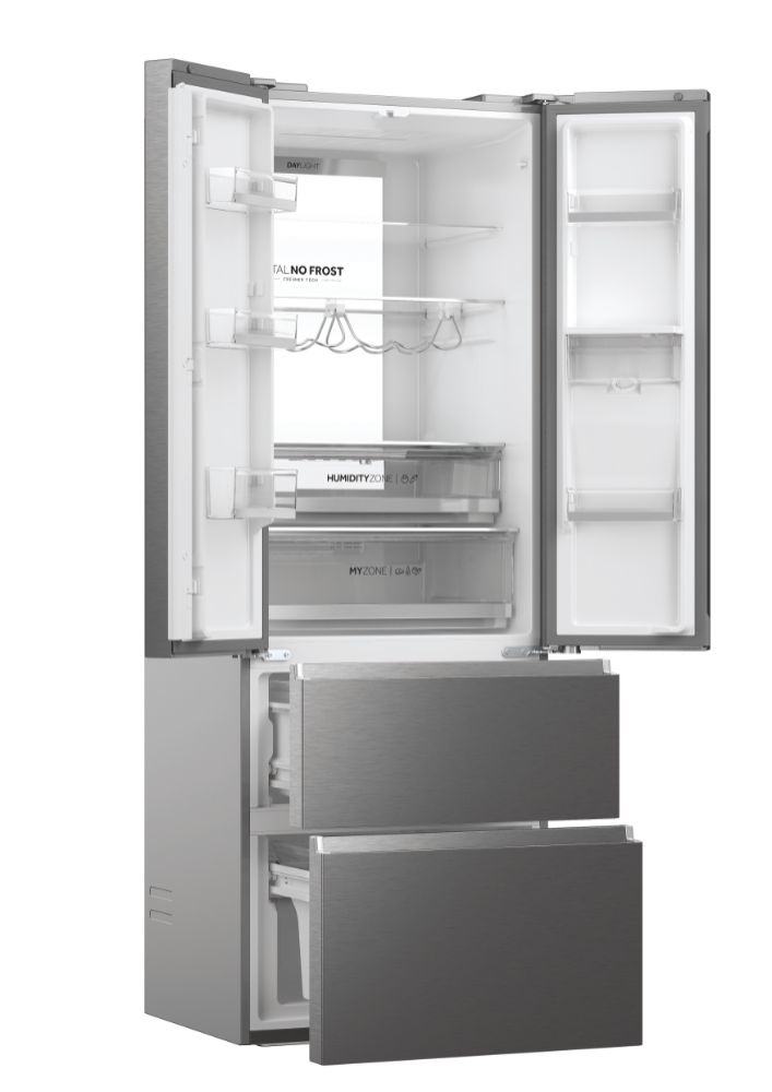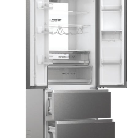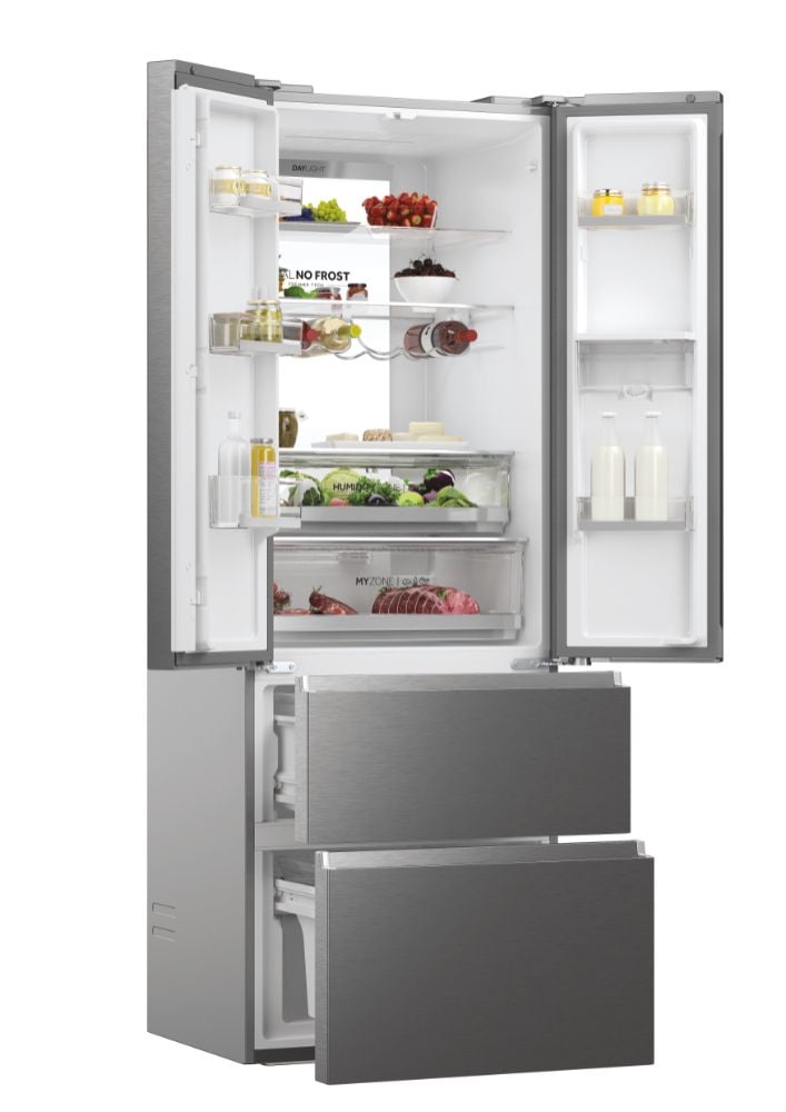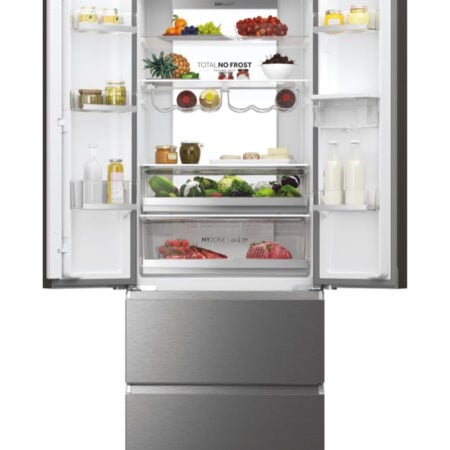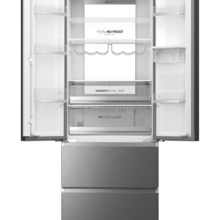 Haier HFR7720DWMP. Totale nettocapaciteit: 477 l, Klimaatklasse: SN-T, Geluidsniveau: 37 dB. Nettocapaciteit koelkast: 337 l, No Frost (koelkast), Multi-luchtwegsysteem (koelkast), Aantal planken koelkast: 2, Aantal groente lades: 1. Nettocapaciteit vriezer: 140 l, Vriescapaciteit: 10 kg/24u, No Frost (vriezer). Vers zone compartiment. Energie-efficiëntieklasse: D, Jaarlijks energieverbruik: 242 kWu. Kleur van het product: Platina, Roestvrijstaal