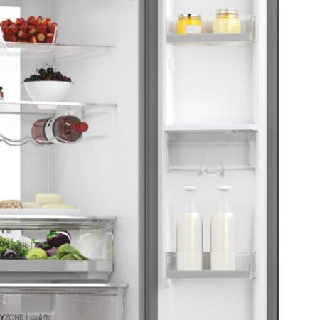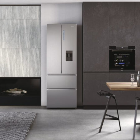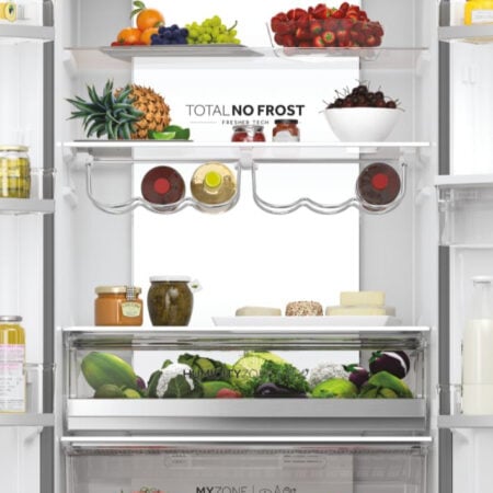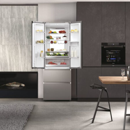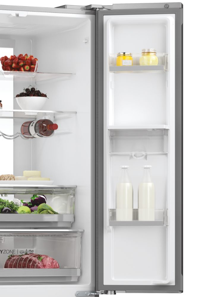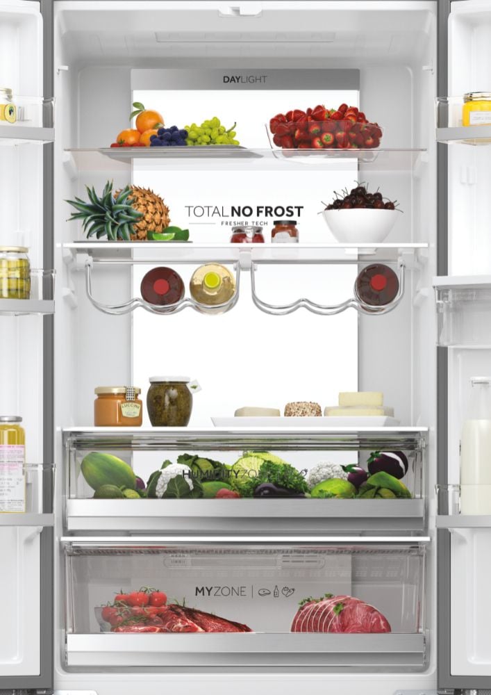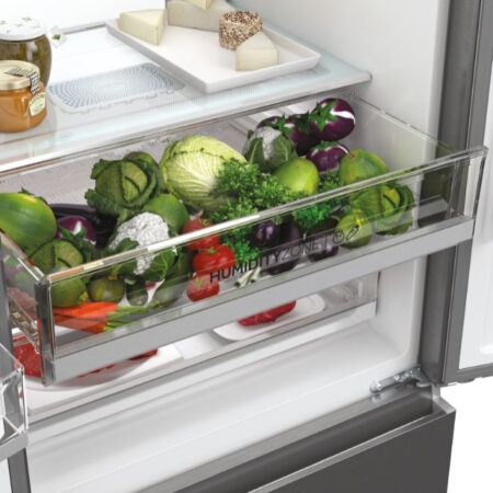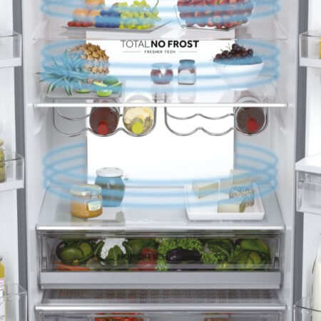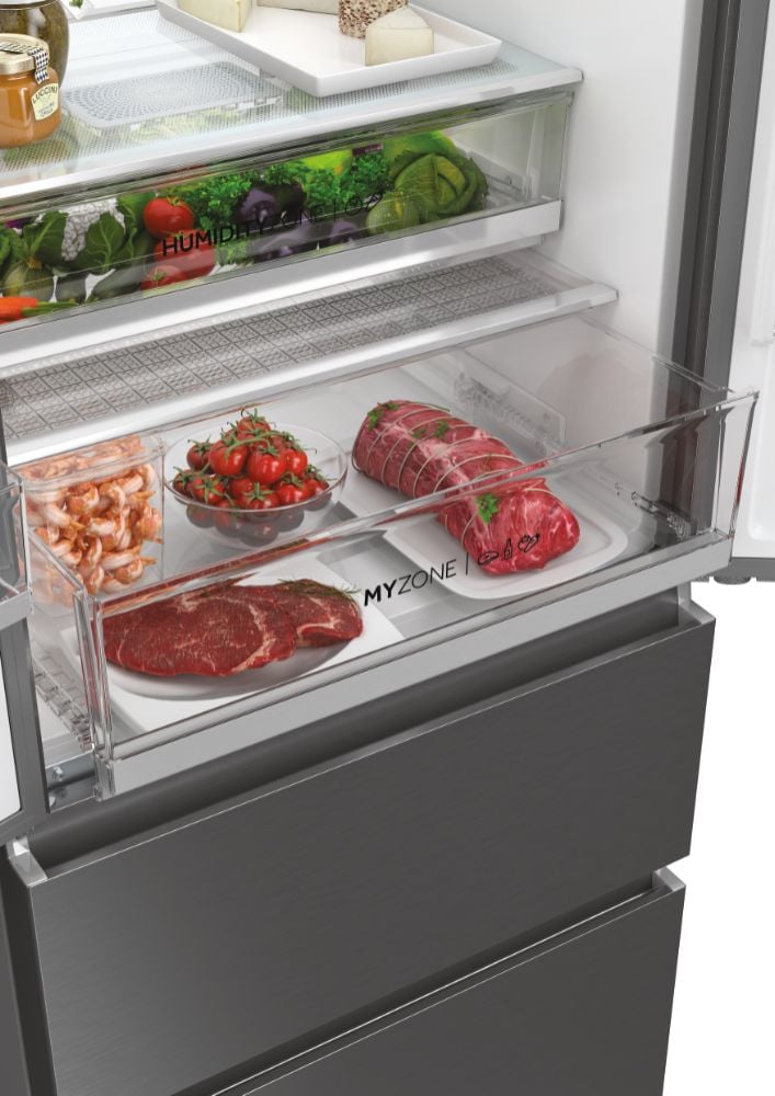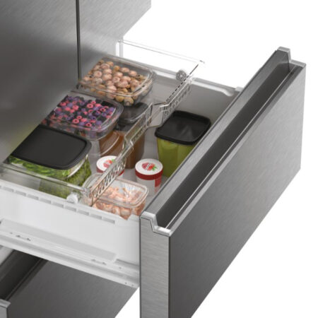 Haier HFR7720DWMP. Totale nettocapaciteit: 477 l, Klimaatklasse: SN-T, Geluidsniveau: 37 dB. Nettocapaciteit koelkast: 337 l, No Frost (koelkast), Multi-luchtwegsysteem (koelkast), Aantal planken koelkast: 2, Aantal groente lades: 1. Nettocapaciteit vriezer: 140 l, Vriescapaciteit: 10 kg/24u, No Frost (vriezer). Vers zone compartiment. Energie-efficiëntieklasse: D, Jaarlijks energieverbruik: 242 kWu. Kleur van het product: Platina, Roestvrijstaal