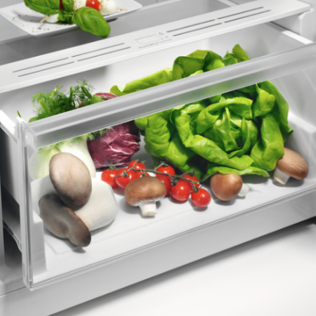Een ruime groentelade over de volle breedte, ontworpen om alles wat je koopt te bewaren. Zelfs onregelmatig gevormde, langere groenten passen nu gemakkelijk. Van komkommers tot selderij, alles past in deze groentelade.