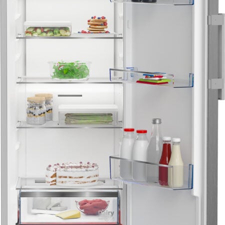 Beko B7RMLNE445ZXP. Nettocapaciteit koelkast: 365 l, No Frost system, Klimaatklasse: SN-T, Geluidsniveau: 35 dB. Type beeldscherm: LED, Aantal planken koelkast: 6, Aantal groente lades: 2. Soort lamp: LED. Deurscharnieren: Rechts. Jaarlijks energieverbruik: 113,9 kWu, Energie-efficiëntieklasse: D. Gewicht: 66 kg. Kleur van het product: Roestvrijstaal