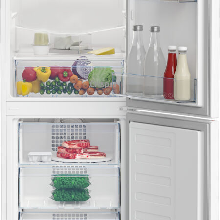 Beko RCHE300K40WN. Apparaatplaatsing: Vrijstaand, Kleur van het product: Wit, Plankmateriaal: Glas. Totale nettocapaciteit: 300 l, Klimaatklasse: SN-ST, Geluidsemissieklasse: C. Nettocapaciteit koelkast: 168 l, Soort lamp: LED. Vriezer positie: Onder, Nettocapaciteit vriezer: 102 l, Vriescapaciteit: 5,5 kg/24u. Energie-efficiëntieklasse: E, Jaarlijks energieverbruik: 245 kWu, Energie-efficiëntieschaal: A tot G
