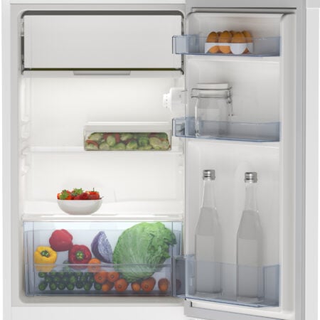 Beko TS190340N. Apparaatplaatsing: Vrijstaand, Kleur van het product: Wit, Deurscharnieren: Rechts. Totale nettocapaciteit: 85 l, Klimaatklasse: T, Geluidsemissieklasse: C. Nettocapaciteit koelkast: 73 l, Soort lamp: LED. Vriezer positie: Boven, Nettocapaciteit vriezer: 12 l, Bewaartijd bij stroomuitval: 10 uur. Energie-efficiëntieklasse: E, Jaarlijks energieverbruik: 109 kWu, Energie-efficiëntieschaal: A tot G