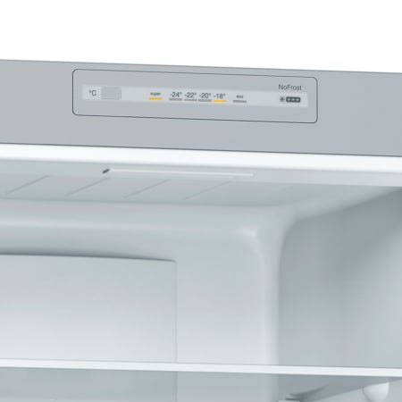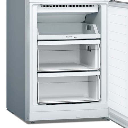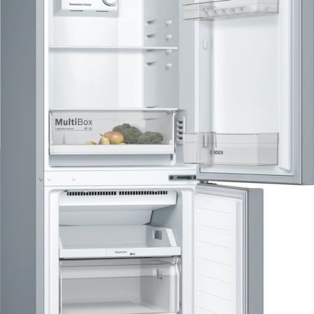 Bosch Serie 2 KGN33NLEB. Totale nettocapaciteit: 282 l. Deurscharnieren: Rechts, Type beeldscherm: LED. Klimaatklasse: SN-T, Geluidsniveau: 42 dB. Nettocapaciteit koelkast: 193 l, No Frost (koelkast), Multi-luchtwegsysteem (koelkast), Koelkast binnenverlichting. Nettocapaciteit vriezer: 89 l, Vriescapaciteit: 11 kg/24u. Vers zone compartiment. Energie-efficiëntieklasse: E, Jaarlijks energieverbruik: 237 kWu. Kleur van het product: Roestvrijstaal