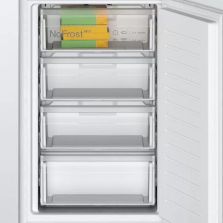 Bosch Serie 2 KIN85NSE0G. Totale nettocapaciteit: 249 l. Deurscharnieren: Rechts. Klimaatklasse: SN-ST, Geluidsniveau: 39 dB. Nettocapaciteit koelkast: 150 l, No Frost (koelkast), Koelkast binnenverlichting, Aantal planken koelkast: 3. Nettocapaciteit vriezer: 99 l, Vriescapaciteit: 5,5 kg/24u, No Frost (vriezer). Vers zone compartiment. Energie-efficiëntieklasse: E, Jaarlijks energieverbruik: 239 kWu. Kleur van het product: Wit