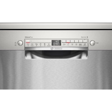 De Bosch SMS2HMI04E is een vrijstaande vaatwasser behorend tot de 2-serie van Bosch en uitgevoerd in het rvs-look met een roestvrijstalen kuip, een aparte besteklade bovenin de kuip en een geluidsniveau van 42 dB. Interessant is het zuinige energieklasse D label en het waterverbruik van 9 liter per programma. Voor het drogen van de vaat maakt de SMS2HMI04E gebruik van het droogsysteem met warmtewisselaar.