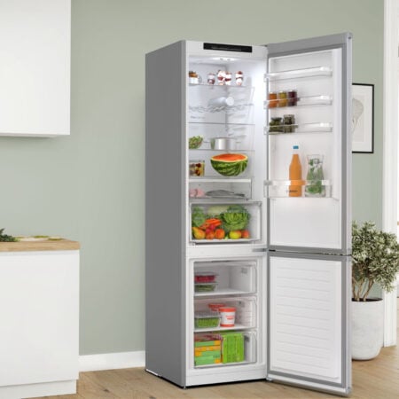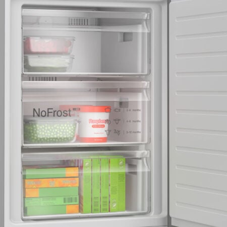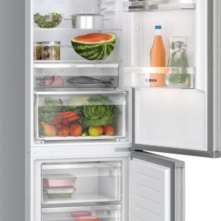 Bosch Serie 4 KGN392LAG. Totale nettocapaciteit: 363 l. Deurscharnieren: Rechts. Klimaatklasse: SN-T, Geluidsniveau: 29 dB. Nettocapaciteit koelkast: 260 l, No Frost (koelkast), Multi-luchtwegsysteem (koelkast), Koelkast binnenverlichting. Nettocapaciteit vriezer: 103 l, Vriescapaciteit: 10 kg/24u, No Frost (vriezer). Vers zone compartiment. Energie-efficiëntieklasse: A, Jaarlijks energieverbruik: 112 kWu. Kleur van het product: Metallic