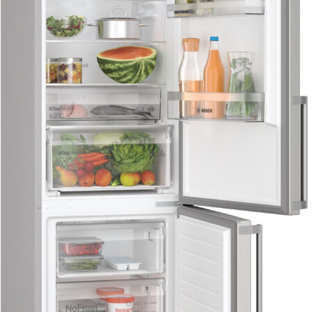 Bosch Serie 4 KGN39VIBT. Totale nettocapaciteit: 363 l. Deurscharnieren: Rechts. Klimaatklasse: SN-T, Geluidsniveau: 33 dB. Nettocapaciteit koelkast: 260 l, No Frost (koelkast), Multi-luchtwegsysteem (koelkast), Koelkast binnenverlichting. Nettocapaciteit vriezer: 103 l, Vriescapaciteit: 10 kg/24u, No Frost (vriezer). Vers zone compartiment. Energie-efficiëntieklasse: B, Jaarlijks energieverbruik: 129 kWu. Kleur van het product: Roestvrijstaal