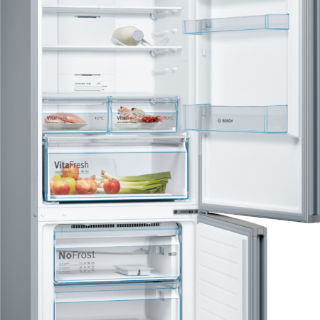 Bosch Serie 4 KGN49XLEA. Totale nettocapaciteit: 438 l. Deurscharnieren: Rechts, Type beeldscherm: LED. Klimaatklasse: SN-T, Geluidsniveau: 40 dB. Nettocapaciteit koelkast: 330 l, Multi-luchtwegsysteem (koelkast), Koelkast binnenverlichting, Aantal planken koelkast: 5. Nettocapaciteit vriezer: 108 l, Vriescapaciteit: 15 kg/24u, No Frost (vriezer). Energie-efficiëntieklasse: E, Jaarlijks energieverbruik: 259 kWu. Kleur van het product: Roestvrijstaal