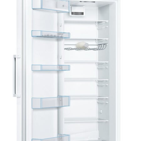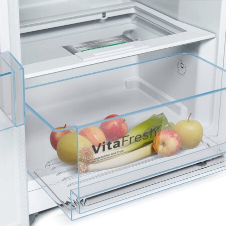De Bosch KSV36VWEP heeft een koelinhoud van 346 liter, dat gelijk staat aan de wekelijkse boodschappen van 5 personen of meer. Voor je courgettes en paprika’s heeft deze 1-deurs koelkast een vershoudzone onderin. Je stelt hier de luchtvochtigheid naar wens in, zodat je minder boodschappen weggooit en alles langer vers blijft. De luchtcirculatie zorgt ervoor dat het op de bovenste plank even koel is als op de onderste plank. Het maakt niet uit waar je je Griekse yoghurt of pesto neerzet. Je hebt jarenlang plezier van je aankoop, want met de topklasse bouwkwaliteit gaat deze koelkast extra lang mee.
