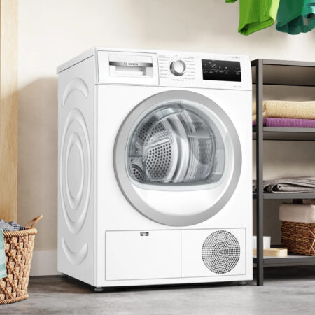 Bosch Serie 4 WTH85223GB. Apparaatplaatsing: Vrijstaand, Type lader: Voorbelading, Droogsysteem: Warmtepomp. Nominale capaciteit: 8 kg, Condensatie-efficiëntieklasse: B, Droogprogramma’s: 40min, Blouse/shirt, Katoen, Donzen kleding/dekbed, Strijkvrij, Mix, Sport, Droogtijd instelbaar,…. Startvertraging: 24 uur. Energie-efficiëntieklasse: A++, Energie consumptie: 1,87 kWu, Jaarlijks energieverbruik: 236 kWu. Bosch-technologieën (kledingzorg): AntiVibration Design, AutoDry, Herladen, Super Quick 40