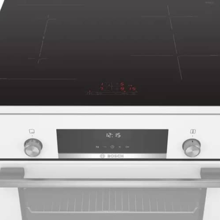 Bosch Serie 6 HLS59D321. Type product: Vrijstaand fornuis, Kleur van het product: Wit, Soort bediening: Draaiknop, Touch. Type kookplaat: Inductiekookplaat zones, Aantal branders/kookzones: 4 zone(s), Soort materiaal (bovenkant): Glaskeramiek. Grootte oven: Middelmaat, Voedingsbron oven: Electrisch, Netto capaciteit oven: 66 l. Energie-efficiëntieklasse: A, Energieverbruik (conventioneel): 0,98 kWu, Aangesloten lading (elektrisch): 7,9 W. Breedte: 600 mm, Diepte: 600 mm, Hoogte: 850 mm