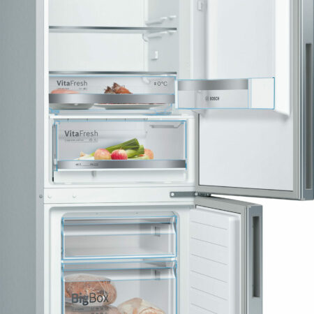 Bosch Serie 6 KGE36ALCA. Totale nettocapaciteit: 308 l. Deurscharnieren: Rechts. Klimaatklasse: SN-T, Geluidsniveau: 38 dB. Nettocapaciteit koelkast: 214 l, Koelkast binnenverlichting, Aantal planken koelkast: 4, Aantal groente lades: 1. Nettocapaciteit vriezer: 94 l, Vriescapaciteit: 14 kg/24u. Vers zone compartiment. Energie-efficiëntieklasse: C, Jaarlijks energieverbruik: 149 kWu. Kleur van het product: Roestvrijstaal