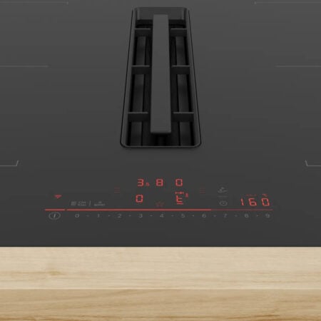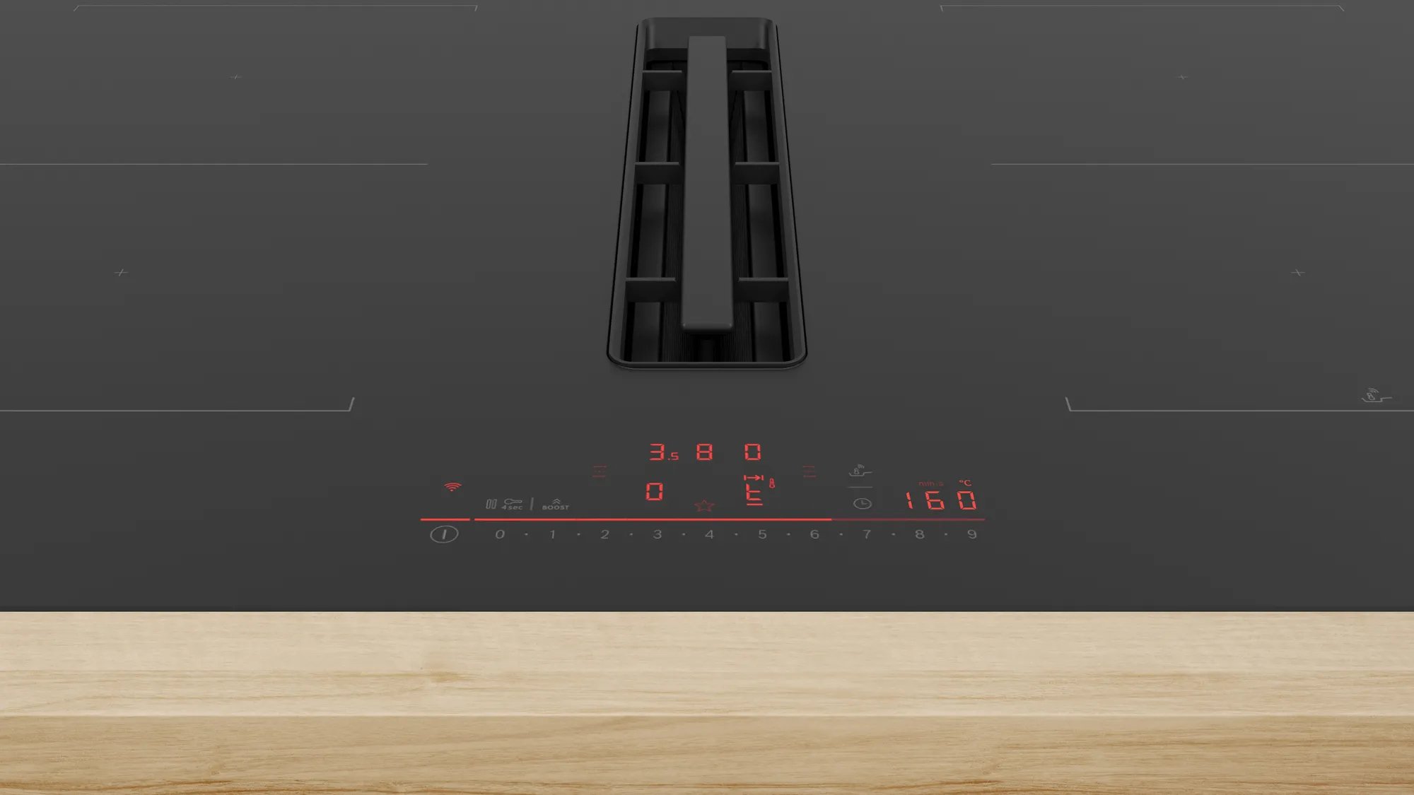 Bosch Serie 6 PVQ811H26E. Kleur van het product: Zwart, Apparaatplaatsing: Ingebouwd, Breedte kookplaat: 80 cm. Soort bediening: Touch, Controle positie: Voorkant, Type timer: Digitaal. Afzuigmethode: Afvoerend/recirculerend, Maximale afzuigcapaciteit: 622 m³/uur, Geluidsniveau: 69 dB. Aangesloten lading (elektrisch): 7400 W, AC-ingangsspanning: 220-240 V, AC-ingangsfrequentie: 50-60 Hz. Bosch-technologieën (koken): AutoOn, CombiZone, DirectSelect, Home Connect, PerfectFry, PowerBoost