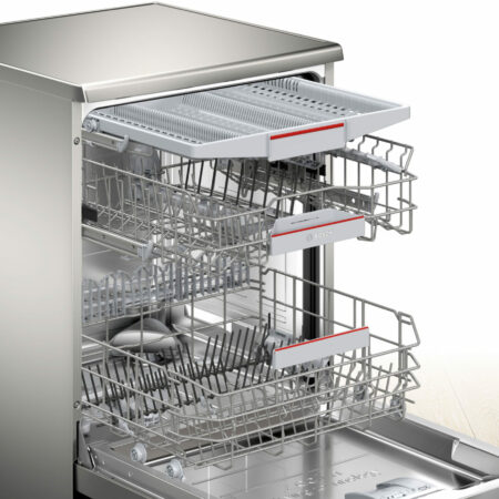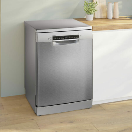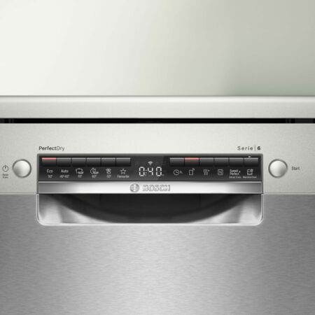 Bosch Serie 6 SMS6TCI00E. Apparaatplaatsing: Vrijstaand, Productafmeting: Volledige grootte (60 cm), Deurkleur: Roestvrijstaal. Aantal couverts: 14 couverts, Geluidsemissieklasse: B, Geluidsniveau: 44 dB. Voetenverstelling: 2 cm, Bedieningsapps ondersteund: Bosch Home Connect. Energie-efficiëntieklasse: A, Waterconsumptie per cyclus: 9,5 l, Energieverbruik per 100 cycli: 54 kWu. Breedte: 600 mm, Diepte: 600 mm, Hoogte: 845 mm