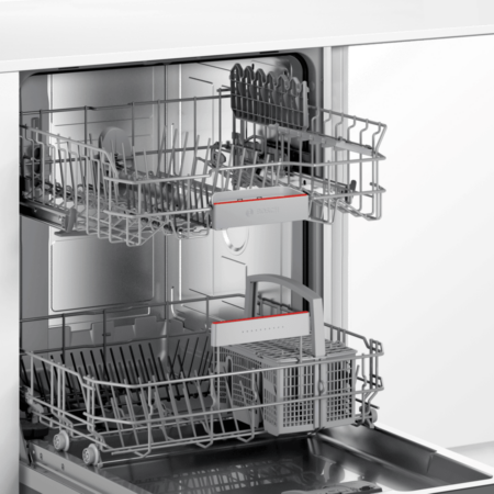 Deze zuinige Bosch SGV4HTX31E inbouw vaatwasser met energieklasse: E heeft een geluidsniveau van slechts 46 dB(A) en verbruikt gemiddeld 9,5 liter water per wasbeurt. De gemiddelde energiekosten bedragen per jaar slechts € 59,24 (per 280 wasbeurten, Eco 50 °C).