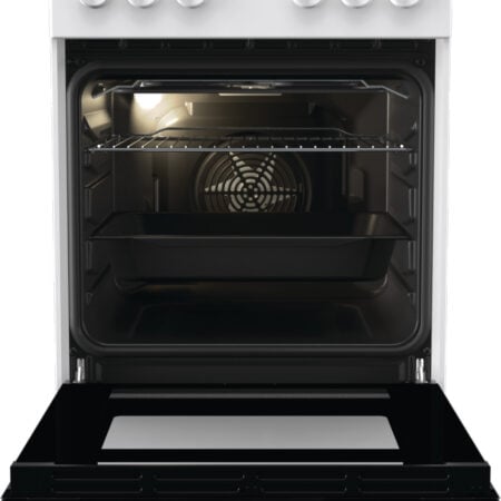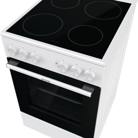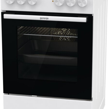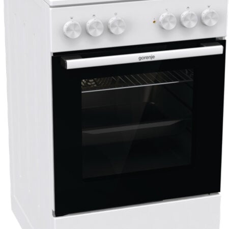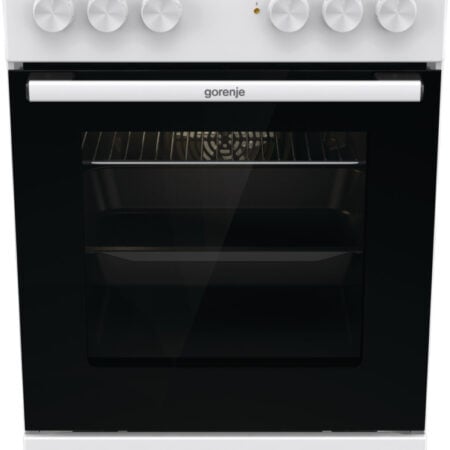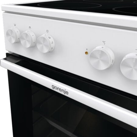 Gorenje GEC5A41WG. Type product: Vrijstaand fornuis, Kleur van het product: Wit, Soort bediening: Draaiknop. Type kookplaat: Keramisch, Aantal branders/kookzones: 4 zone(s), Soort materiaal (bovenkant): Glaskeramiek. Grootte oven: Middelmaat, Voedingsbron oven: Electrisch, Netto capaciteit oven: 62 l. LED-indicatoren: Stroom. Energie-efficiëntieklasse: A, Energieverbruik (conventioneel): 0,98 kWu, Aangesloten lading (elektrisch): 8600 W