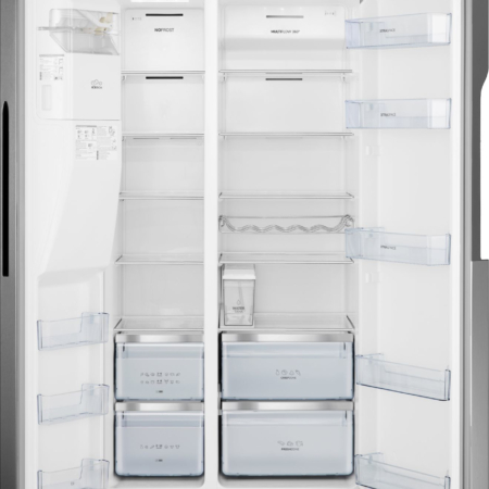 Gorenje NRS9182VX. Apparaatplaatsing: Vrijstaand, Productontwerp: Amerikaanse deur, Kleur van het product: Roestvrijstaal. Totale nettocapaciteit: 562 l, Klimaatklasse: SN-T, Geluidsemissieklasse: D. Nettocapaciteit koelkast: 371 l. Nettocapaciteit vriezer: 191 l, Vriezer positie: Onder, Vriescapaciteit: 13 kg/24u. Energie-efficiëntieklasse: E, Jaarlijks energieverbruik: 323 kWu, Energie-efficiëntieschaal: A tot G