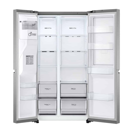 LG GSJV70PZTE. Apparaatplaatsing: Vrijstaand, Productontwerp: Frans deur, Kleur van het product: Zilver. Totale nettocapaciteit: 635 l, Klimaatklasse: T, Geluidsemissieklasse: C. Nettocapaciteit koelkast: 416 l. Nettocapaciteit vriezer: 219 l, Vriezer positie: Ernaast, Vriescapaciteit: 12 kg/24u. Energie-efficiëntieklasse: E, Jaarlijks energieverbruik: 350 kWu, Energie-efficiëntieschaal: A tot G
