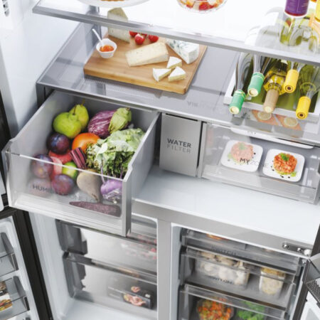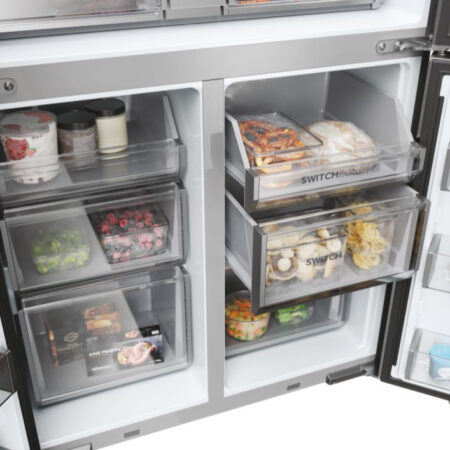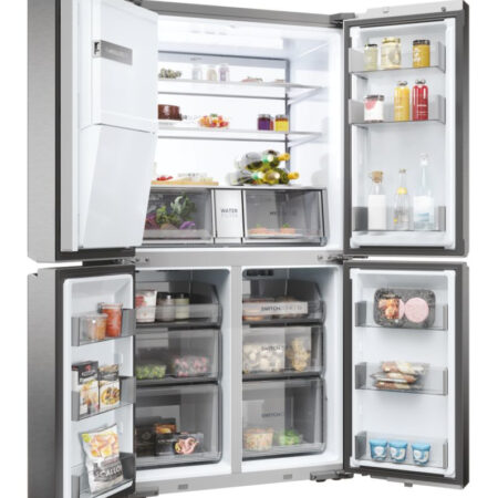 Haier HCR7918EIMP. Apparaatplaatsing: Vrijstaand, Productontwerp: Frans deur, Kleur van het product: Platina, Roestvrijstaal. Totale nettocapaciteit: 601 l, Klimaatklasse: ST, Geluidsemissieklasse: C. Nettocapaciteit koelkast: 323 l, Soort lamp: LED. Nettocapaciteit vriezer: 278 l, Vriezer positie: Onder, Vriescapaciteit: 6 kg/24u. Energie-efficiëntieklasse: E, Jaarlijks energieverbruik: 357 kWu, Energie-efficiëntieschaal: A tot G