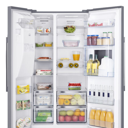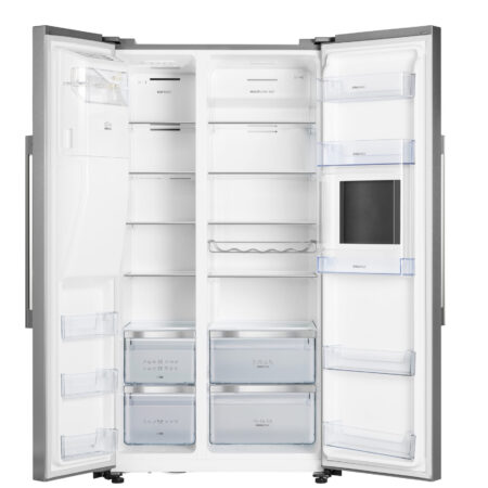 Hisense RS694N4BCE. Apparaatplaatsing: Vrijstaand, Productontwerp: Amerikaanse deur, Kleur van het product: Roestvrijstaal. Totale nettocapaciteit: 562 l, Klimaatklasse: N-T, Geluidsemissieklasse: D. Nettocapaciteit koelkast: 371 l, Soort lamp: LED. Nettocapaciteit vriezer: 191 l, Vriezer positie: Ernaast, Vriescapaciteit: 13 kg/24u. Snoerlengte: 2 m