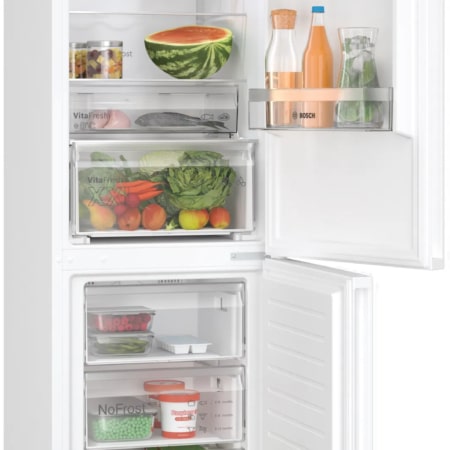 Bosch Serie 4 KGN362WDF. Totale nettocapaciteit: 321 l, Klimaatklasse: SN-T, Geluidsniveau: 35 dB. Nettocapaciteit koelkast: 218 l, No Frost (koelkast), Multi-luchtwegsysteem (koelkast), Aantal planken koelkast: 3, Aantal groente lades: 1. Nettocapaciteit vriezer: 103 l, Vriescapaciteit: 9,5 kg/24u, No Frost (vriezer). Vers zone compartiment. Energie-efficiëntieklasse: D, Jaarlijks energieverbruik: 199 kWu. Kleur van het product: Wit