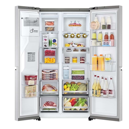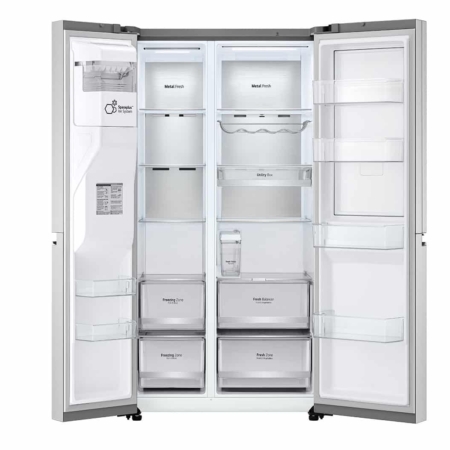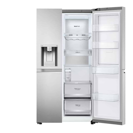 LG GSJV91BSAE. Apparaatplaatsing: Vrijstaand, Productontwerp: Amerikaanse deur, Kleur van het product: Roestvrijstaal. Totale nettocapaciteit: 635 l, Klimaatklasse: T, Geluidsemissieklasse: C. Nettocapaciteit koelkast: 416 l. Nettocapaciteit vriezer: 219 l, Vriezer positie: Ernaast, Vriescapaciteit: 12 kg/24u. Energie-efficiëntieklasse: E, Jaarlijks energieverbruik: 350 kWu