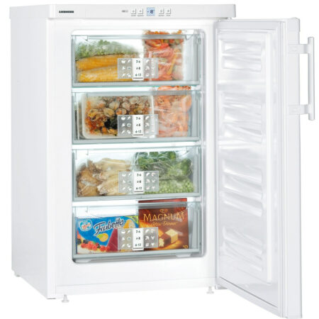 Liebherr GP 1386. Nettocapaciteit vriezer: 103 l, Klimaatklasse: SN-T, Vriescapaciteit: 6 kg/24u, Bewaartijd bij stroomuitval: 14 uur, Geluidsniveau: 39 dB, Aantal sterren: 4*. Deurscharnieren: Rechts. Energie-efficiëntieklasse: D, Jaarlijks energieverbruik: 171 kWu. Kleur van het product: Wit