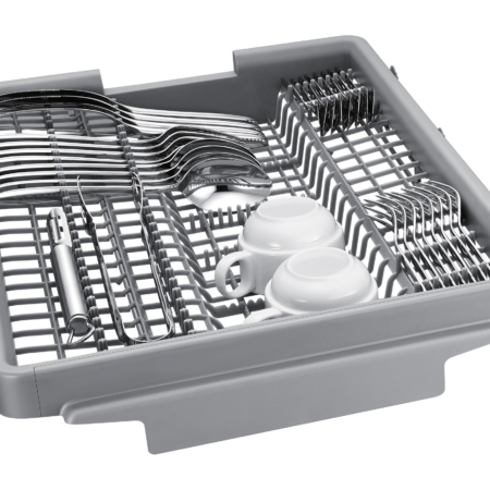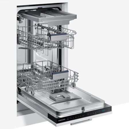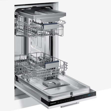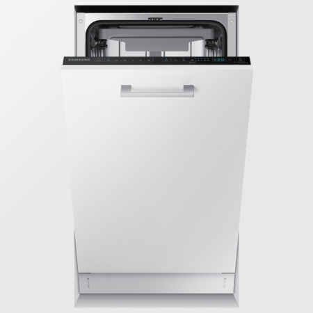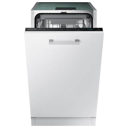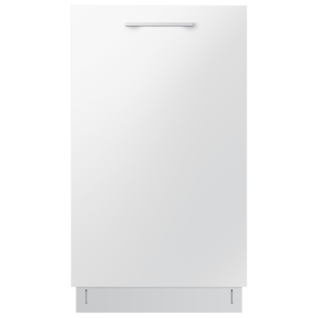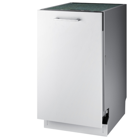 Samsung DW50R4050BB. Apparaatplaatsing: Volledig ingebouwd, Productafmeting: Slimline (45 cm), Deurkleur: Wit. Aantal couverts: 10 couverts, Geluidsemissieklasse: C, Geluidsniveau: 46 dB. Voetenverstelling: 5 cm. Energie-efficiëntieklasse: F, Waterconsumptie per cyclus: 9,9 l, Energieverbruik per 100 cycli: 84 kWu. Breedte: 450 mm, Diepte: 550 mm, Hoogte: 815 mm