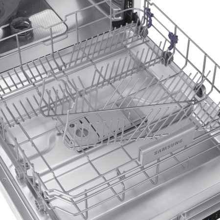 Samsung DW60M6050BB. Apparaatplaatsing: Volledig ingebouwd, Productafmeting: Volledige grootte (60 cm), Soort bediening: Knoppen. Aantal couverts: 14 couverts, Geluidsemissieklasse: B, Geluidsniveau: 44 dB. Voetenverstelling: 3 cm. Energie-efficiëntieklasse: E, Waterconsumptie per cyclus: 10,5 l, Energieverbruik per 100 cycli: 95 kWu. Breedte: 598 mm, Diepte: 550 mm, Hoogte: 815 mm