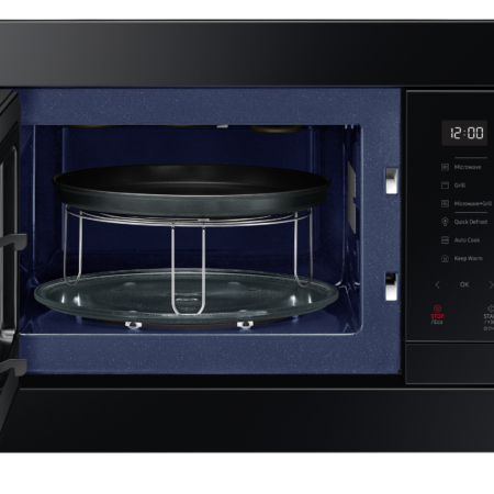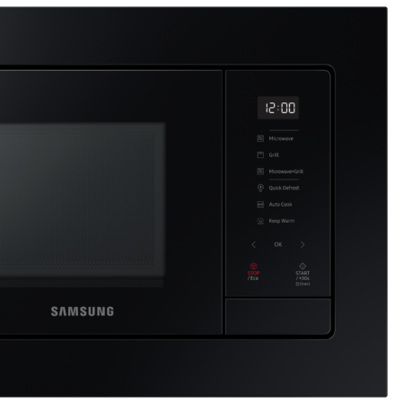 Samsung MG23A7318CK. Apparaatplaatsing: Ingebouwd, Type product: Grill-magnetron, Inhoud (binnenkant): 23 l. Netbelasting: 800 W, AC-ingangsspanning: 230 V, AC-ingangsfrequentie: 50 Hz. Breedte: 489 mm, Diepte: 362 mm, Hoogte: 275 mm