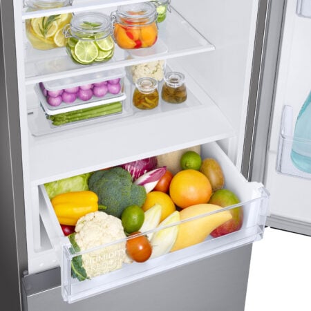 Samsung RB33B612ESA. Totale nettocapaciteit: 344 l. Deurscharnieren: Rechts. Klimaatklasse: SN-T, Geluidsniveau: 35 dB. Nettocapaciteit koelkast: 230 l, No Frost (koelkast), Koelkast binnenverlichting, Aantal planken koelkast: 4, Aantal groente lades: 1. Nettocapaciteit vriezer: 114 l, Vriescapaciteit: 7 kg/24u, No Frost (vriezer). Energie-efficiëntieklasse: E, Jaarlijks energieverbruik: 254 kWu. Kleur van het product: Zilver, Roestvrijstaal