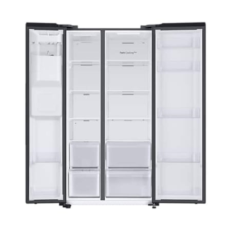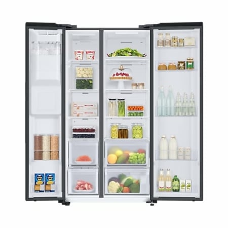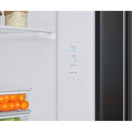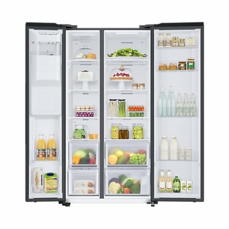 De Samsung RS67A8811B1 is een Amerikaanse koelkast en is van alle gemakken voorzien. De koelruimte heeft een inhoud van 409 liter en is met 4 tempered glass platen, 5 deurvakken, 2 groente- en fruitladen vrij in te delen. Het vriesvak, 225 liter, komt met 4 planken, 2 deurvakken en 2 lades . Ook de ijsmaker bevindt zich in de vriesruimte.
