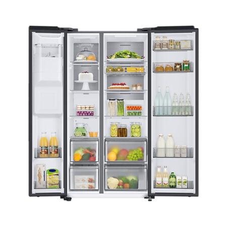 Samsung RS68A884CB1. Apparaatplaatsing: Vrijstaand, Productontwerp: Amerikaanse deur, Kleur van het product: Zwart. Klimaatklasse: SN-T, Geluidsemissieklasse: B, Geluidsniveau: 35 dB. Brutocapaciteit koelkast: 409 l, Soort lamp: LED. Vriezer positie: Ernaast, Vriescapaciteit: 15 kg/24u, Bewaartijd bij stroomuitval: 7 uur. Energie-efficiëntieklasse: C, Jaarlijks energieverbruik: 225 kWu, Energie-efficiëntieschaal: A tot G