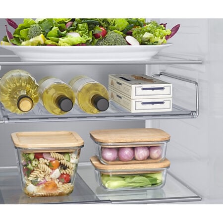 Maak efficiënt gebruik van je koelkastruimte met het multifunctionele flessenplateau. Dankzij de platte vorm is het flessenplateau van de Samsung-koelkast zeer veelzijdig. Je kan er naast flessen namelijk ook andere producten op kwijt, zoals een pizzadoos of eieren. Zo voorkom je de loze ruimte van het reguliere flessenrek en gebruik je de beschikbare opbergruimte efficiënter.