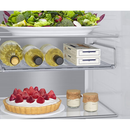 Met een koelkast met een moderne uitstraling die naadloos in jouw keuken past. Het minimalistische ontwerp heeft platte deuren, verzonken deurgrepen, een geïntegreerd display, een georganiseerd wijnrek en grijze boodschappendozen.
