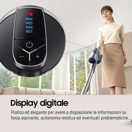 Dankzij het geïntegreerde digitale display kun je altijd zien of je stofzuiger optimaal presteert. Je kunt de status van het apparaat eenvoudig controleren. Een handige manier om je stofzuiger te gebruiken en te onderhouden. Je ziet in één oogopslag of de stofzuiger aan of uit staat, welke van de drie zuigkrachtniveaus (Min/Mid/Max) is ingesteld en of de natte borstel is bevestigd. Je ziet ook of er storingen of problemen zijn, zoals blokkades in de luchtstroom, problemen met de borstel of een ontbrekend filter. Daarnaast zet je de stofzuiger gemakkelijk met één druk op de knop aan en uit. Deze hoeft tijdens het stofzuigen niet ingedrukt gehouden te worden.