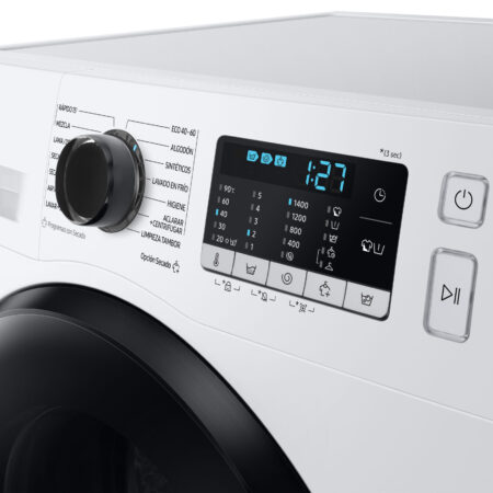 Samsung WD90TA046BE, Voorbelading, Vrijstaand, Wit, Links, Knoppen, Draaiknop, LED