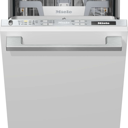 Miele G 5690 SCVi SL. Apparaatplaatsing: Volledig ingebouwd, Productafmeting: Slimline (45 cm), Kleur bedieningspaneel: Roestvrijstaal. Aantal couverts: 9 couverts, Geluidsemissieklasse: B, Geluidsniveau: 44 dB. Energie-efficiëntieklasse: D, Waterconsumptie per cyclus: 7,7 l, Energieverbruik per 100 cycli: 62 kWu. Breedte: 448 mm, Diepte: 570 mm, Hoogte: 805 mm