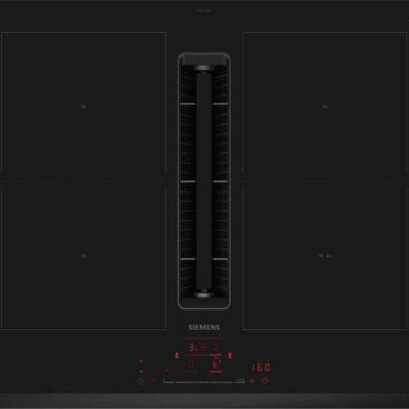 Siemens iQ500 ED631HQ26E. Kleur van het product: Zwart, Apparaatplaatsing: Ingebouwd, Breedte kookplaat: 60 cm. Soort bediening: Touch, Controle positie: Voorkant. Afzuigmethode: Recirculerend, Maximale afzuigcapaciteit: 622 m³/uur, Geluidsniveau: 69 dB. Aangesloten lading (elektrisch): 7400 W, AC-ingangsspanning: 415 V, AC-ingangsfrequentie: 220 – 240/380 Hz. Siemens-technologieën (koken): Home Connect, combiZone, inductionAir Plus, powerBoost, quickStart, touchSlider, fryingSensor