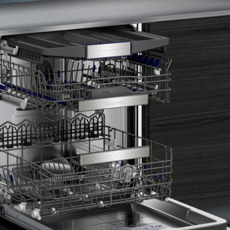 Siemens iQ700 SN87TX02CE. Apparaatplaatsing: Volledig ingebouwd, Productafmeting: Volledige grootte (60 cm), Kleur bedieningspaneel: Zwart. Aantal couverts: 14 couverts, Geluidsemissieklasse: B, Geluidsniveau: 42 dB. Energie-efficiëntieklasse: A, Waterconsumptie per cyclus: 9,5 l, Energieverbruik per 100 cycli: 54 kWu. Breedte: 598 mm, Diepte: 550 mm, Hoogte: 815 mm