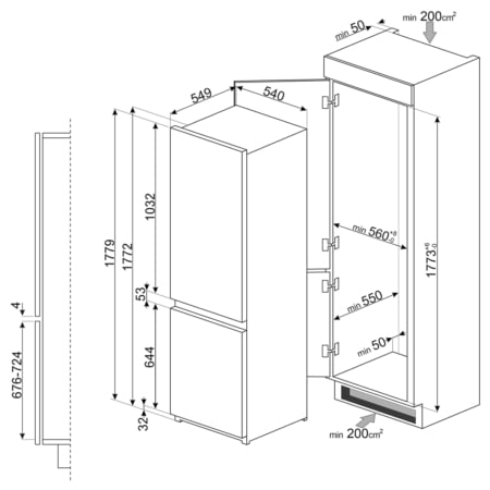 Smeg C4173N1F. Totale nettocapaciteit: 254 l. Deurscharnieren: Rechts, Type beeldscherm: LED. Klimaatklasse: SN-T, Geluidsniveau: 36 dB. Nettocapaciteit koelkast: 193 l, Koelkast binnenverlichting, Aantal planken koelkast: 4, Aantal groente lades: 2. Nettocapaciteit vriezer: 61 l, Vriescapaciteit: 4 kg/24u, No Frost (vriezer). Energie-efficiëntieklasse: F, Jaarlijks energieverbruik: 268 kWu. Kleur van het product: Wit