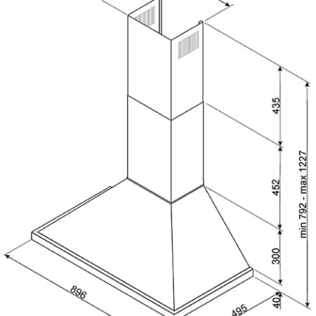 Smeg KPF9AN. Maximale afzuigcapaciteit: 781 m³/uur, Afzuigmethode: Luchtafvoer, Fluid dynamic efficiency class: A. Soort: Muurmontage, Kleur van het product: Antraciet, Soort bediening: Draaiknop. Soort vetfilter: Roestvrijstaal, Aantal filters: 3 stuk(s). Vermogen lamp: 2 W, Aantal lampen: 2 gloeilamp(en), Type lamp: LED. Energie-efficiëntieklasse: A+, Jaarlijks energieverbruik: 40,1 kWu, Netbelasting: 277 W