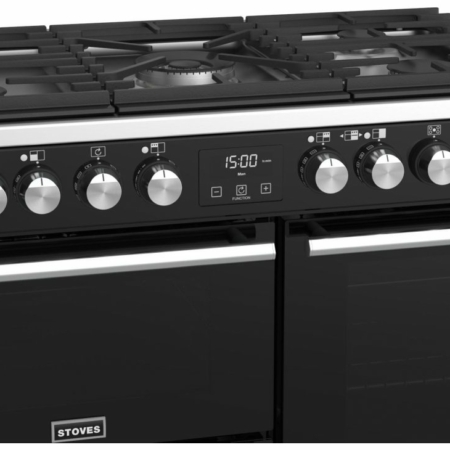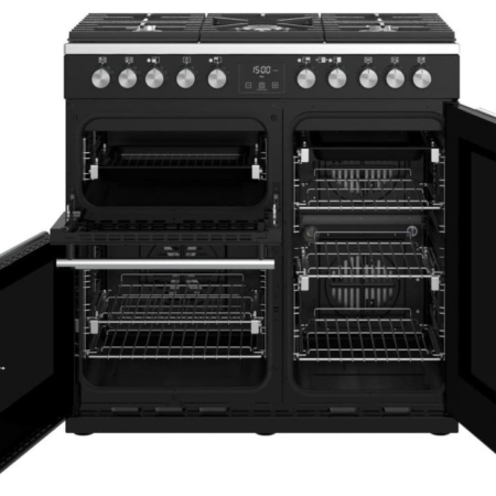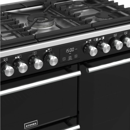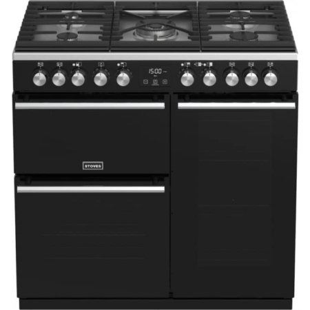 Stoves Richmond Deluxe S900DF. Type product: Vrijstaand fornuis, Kleur van het product: Zwart, Soort bediening: Knoppen, Draaiknop. Type kookplaat: Gaskookplaat, Aantal branders/kookzones: 5 zone(s), Type gas: Natuurlijk gas. Grootte oven: Klein, Voedingsbron oven: Electrisch, Netto capaciteit oven: 31 l. Oven 2 afmetingen: Middelmaat, Oven 2 voedingsbron: Electrisch, Oven 2 positie: Linksonder. Oven 3 grootte: Groot, Oven 3 voedingsbron: Electrisch, Oven 3 positie: Rechts