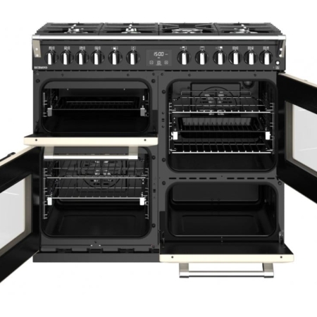 De Stoves Richmond S1000 DF Deluxe creme is een 100 cm. breed design fornuis uitgevoerd in de kleur creme / zwart. Het kookgedeelte bestaat uit 7 gasbranders en heeft een wokbrander van 5,0 kW in het midden. De vangschaal is van hoogwaardig gas-op-glas.