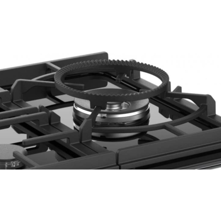 Alle branders worden automatisch ontstoken bij het opendraaien van de knoppen en beschikken over thermokoppel vlambeveiliging. Indien tijdens het koken de vlam uit waait, dan wordt het gas automatisch afgesloten. Bovenop de branders liggen vier stabiele gietijzeren pandragers.