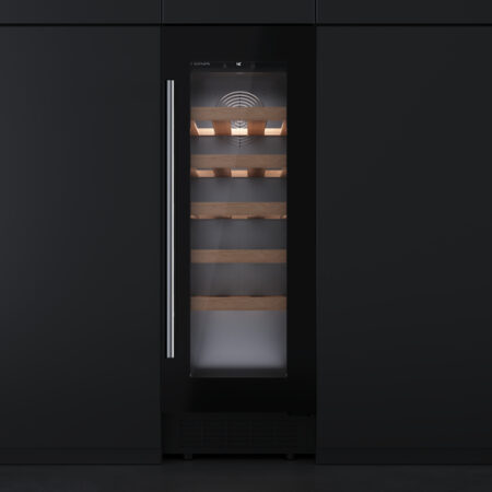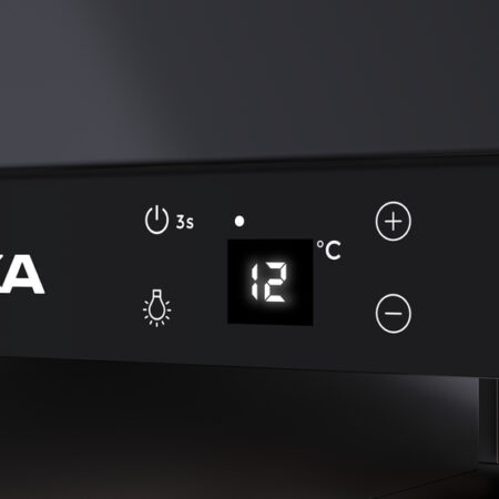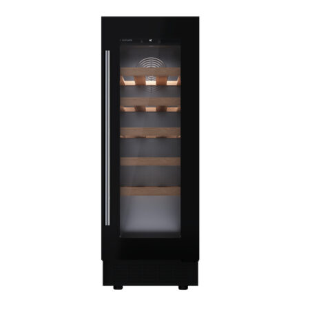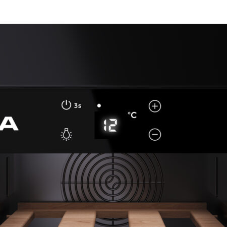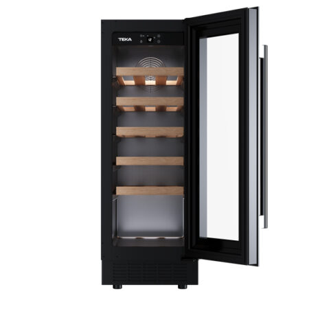 Teka 113610004. Apparaatplaatsing: Ingebouwd, Kleur behuizing: Zwart, Inwendige kleur: Zwart. Flessen-capaciteit: 20 fles(sen), Type product: Thermo-elektrische wijnkoeler, Klimaatklasse: N-ST. Energie-efficiëntieklasse: F, Jaarlijks energieverbruik: 98 kWu, Energie-efficiëntieschaal: A tot G. Locatie van display: Op de deur, Soort lamp: LED. Breedte: 295 mm, Diepte: 573 mm, Hoogte: 820 mm